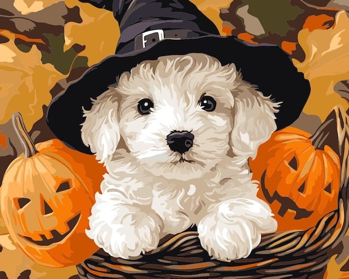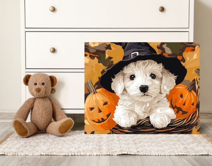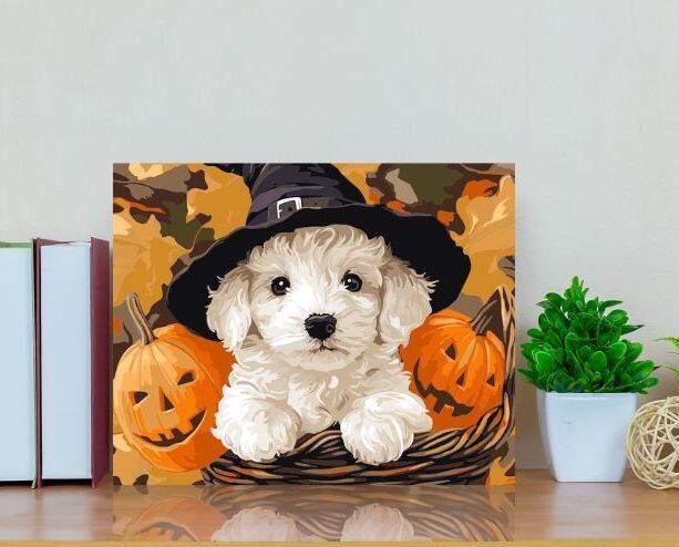 新作 数字油絵『ハロウィン 仔犬』アクリル絵の具で作る。数字で塗り絵 油絵風 (50x40cm)