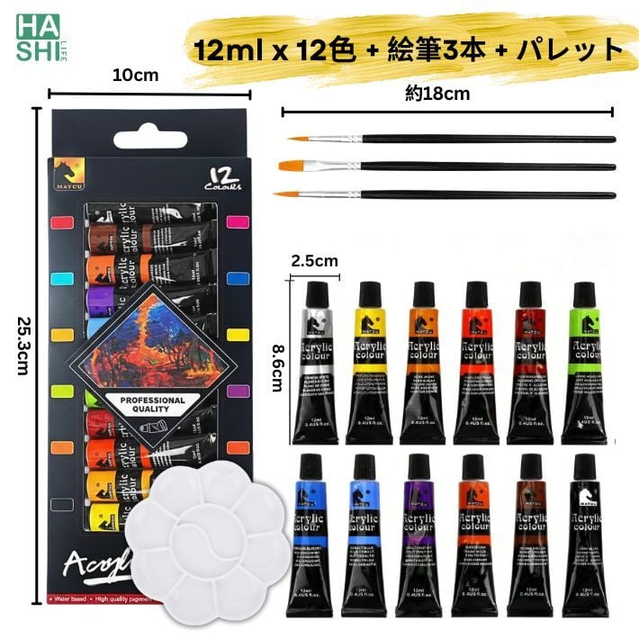 絵の具 12色セット アクリル絵の具 パレット・絵筆3本付き 速乾 チューブ 12ml 工作 絵 顔料 画材 お絵描き 学校用 白 ファーストアート アート 大人の塗り絵 アクリル顔料 ブラシ付き 子供用 イラスト 塗り絵 クラフト 画材セット 美術 宿題 課題 コンパクト