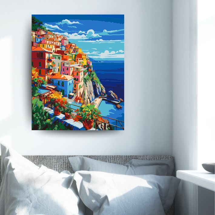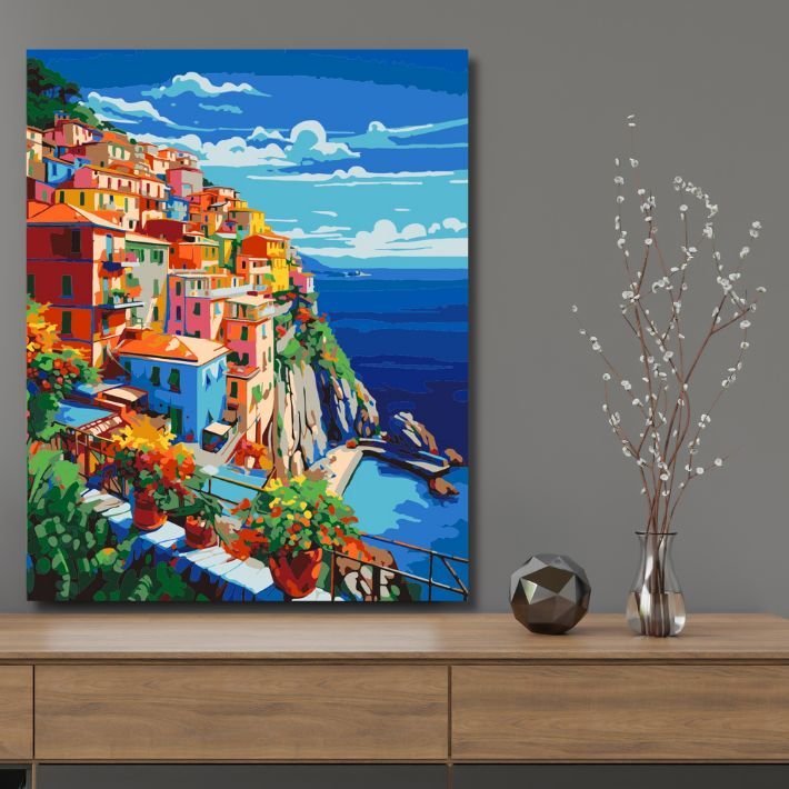 新作『崖の上のカラフルな家』アクリル絵の具で作る。数字で塗り絵 数字油絵 ナンバーペイント 油絵風 (50x40cm) No.189