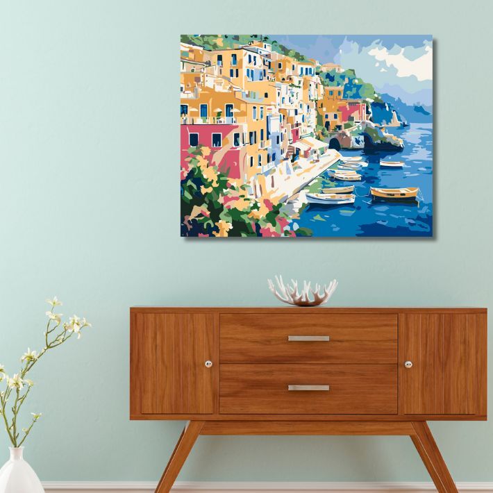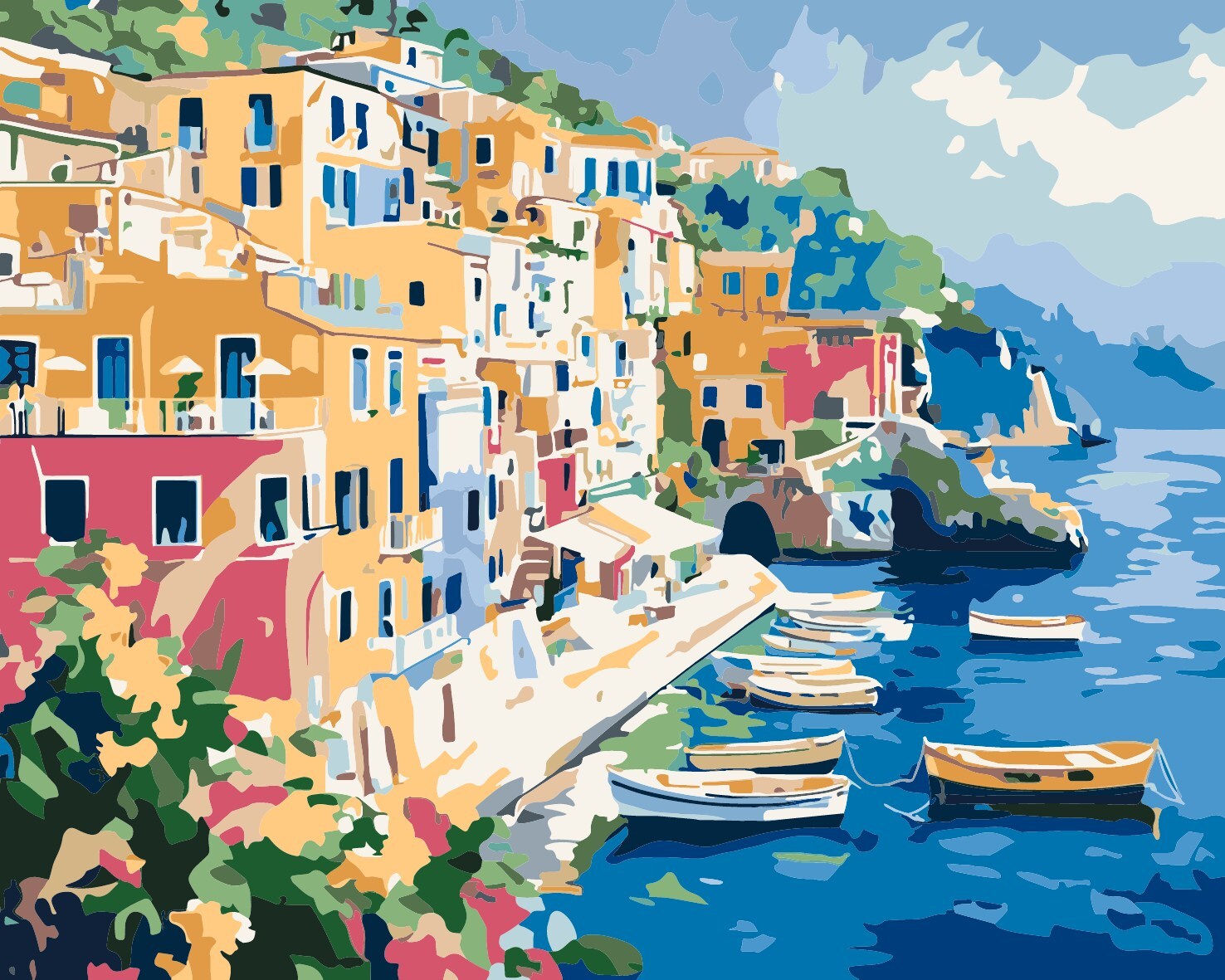 新作『地中海の港町』アクリル絵の具で作る。数字で塗り絵 数字油絵 ナンバーペイント 油絵風 (50x40cm) No.188
