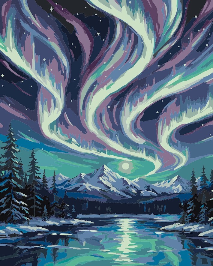 新作 『 氷河とオーロラ』アクリル絵の具で作る。数字で塗り絵 数字油絵 ナンバーペイント 油絵風 (50x40cm) No.196