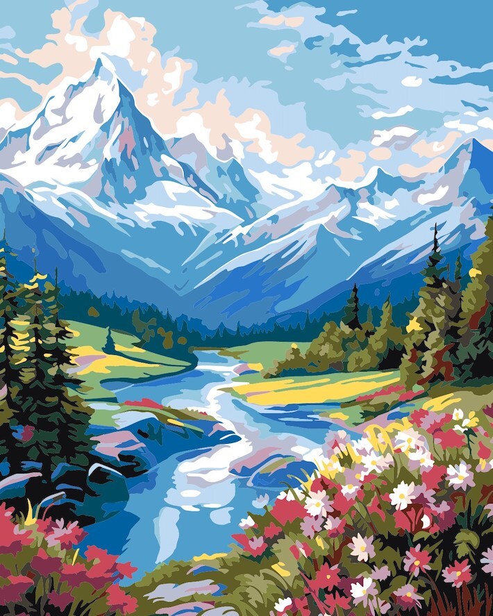 新作 『アルプスの雪解け』アクリル絵の具で作る。数字で塗り絵 数字油絵 ナンバーペイント 油絵風 (50x40cm) No.198