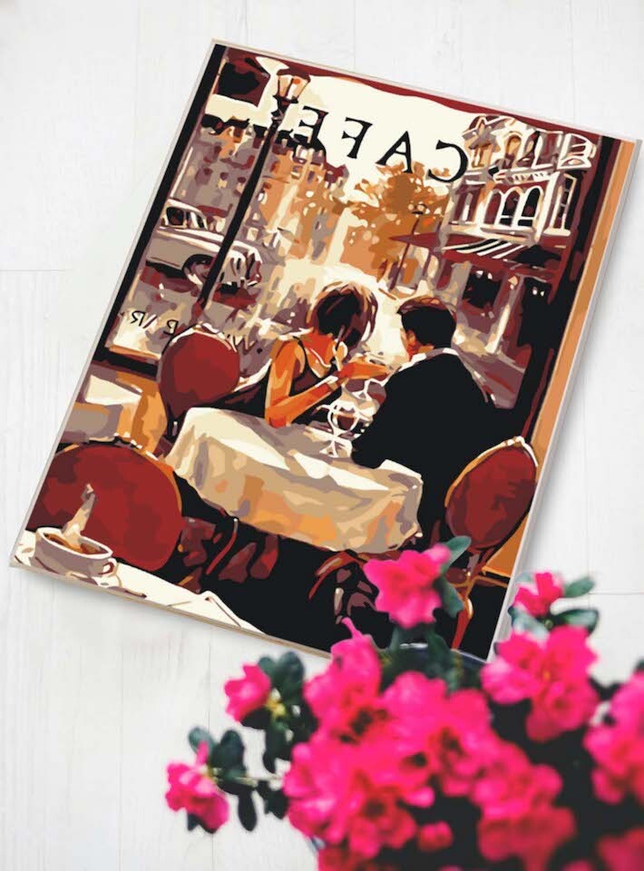 組立不要 再入荷!『フレンチカフェ』アクリル絵の具で作る。数字で塗り絵 油絵風 (50x40cm、フレーム付) No. 035