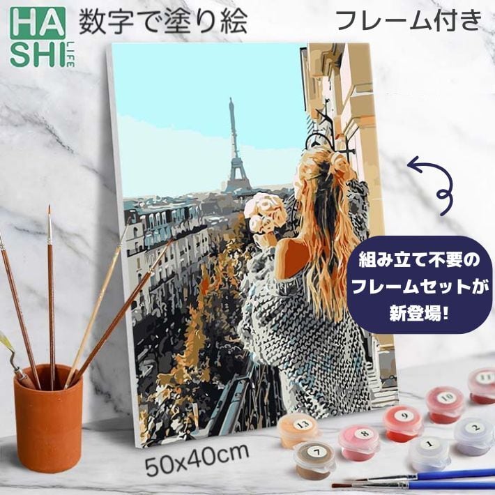 『パリのベランダ』アクリル絵の具で作る。数字で塗り絵 油絵風 (40x50cm、フレーム付き)