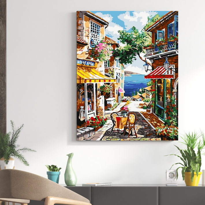 『海辺の街並み ヨーロッパ』アクリル絵の具で作る。数字で塗り絵 油絵風 (50x40cm、選べる内枠フレーム付)