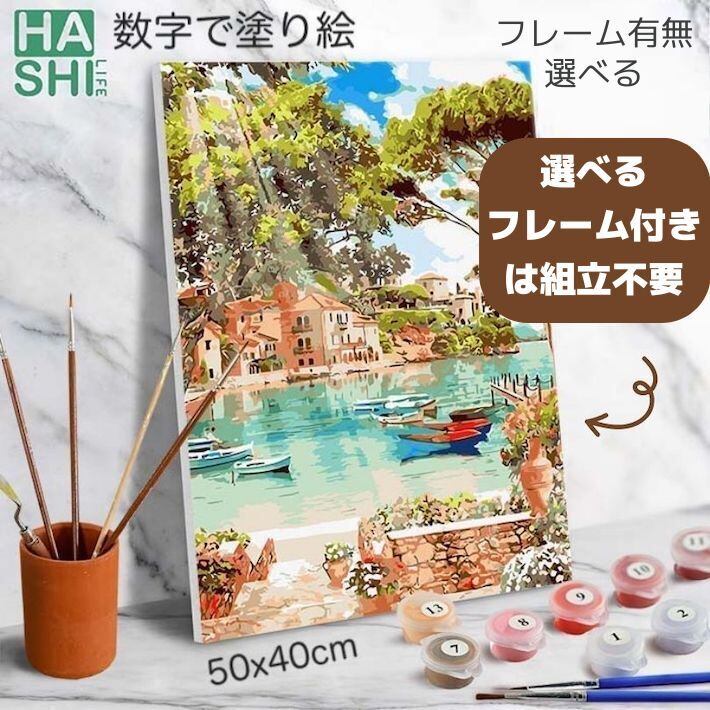 再入荷! 人気再販『朝の木漏れ日』アクリル絵の具で作る。数字で塗り絵 油絵風 (40x50cm、フレーム付き)No.066