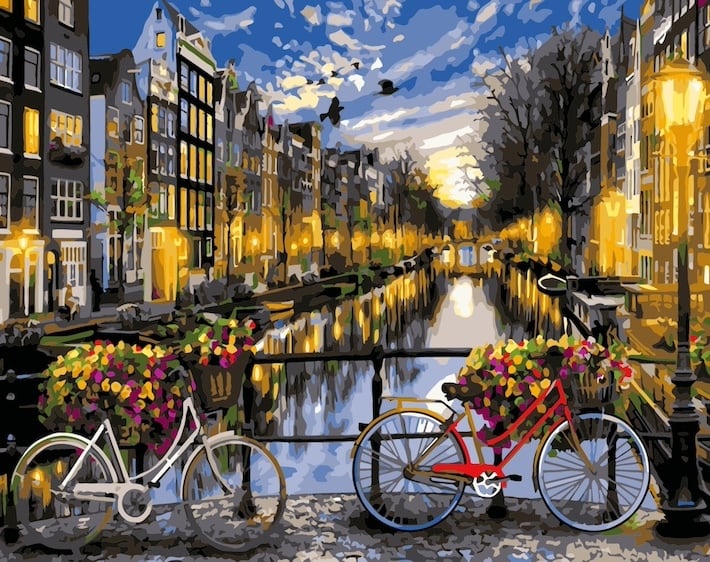 選べる組立不要のフレーム付き! 『運河の夕暮れ』アクリル絵の具で作る。数字で塗り絵 数字油絵 ナンバーペイント ぬりえ アート 油絵風 (50x40cm)