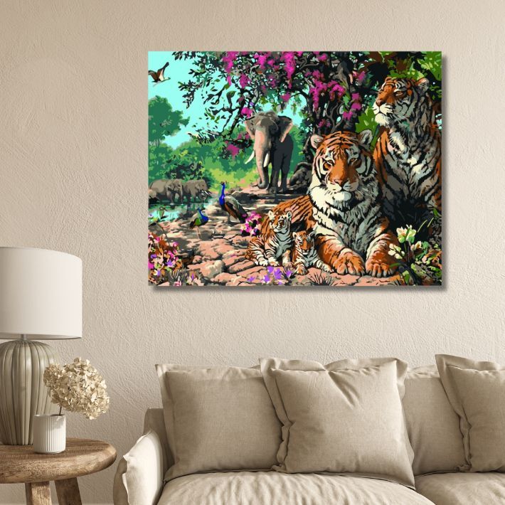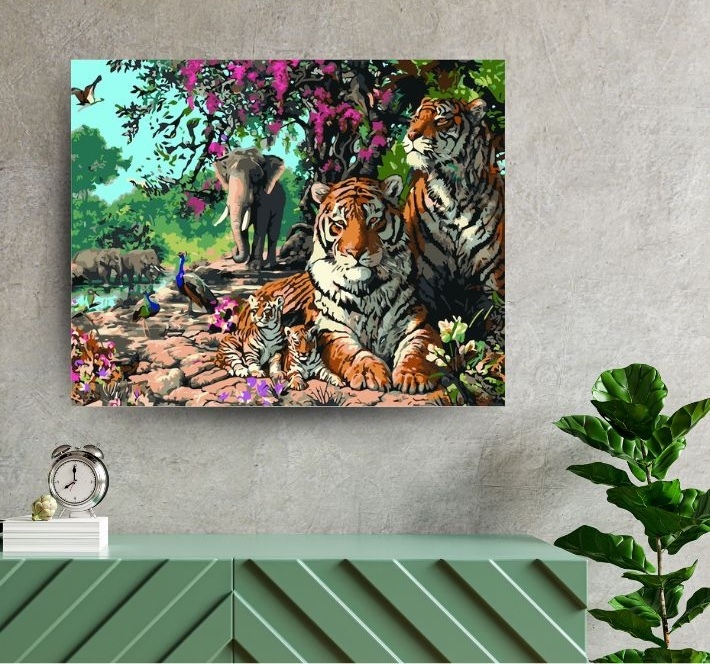 組立不要! 『トラ』アクリル絵の具で作る。数字で塗り絵 油絵風 (50x40cm、フレーム付 選べる) No.131