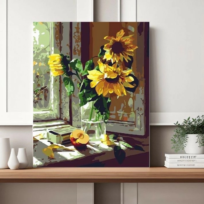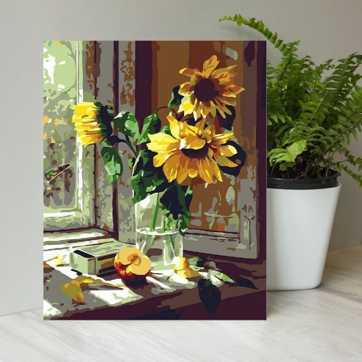 組立不要! 『窓辺の向日葵』アクリル絵の具で作る。数字で塗り絵 油絵風 (50x40cm、フレーム付)